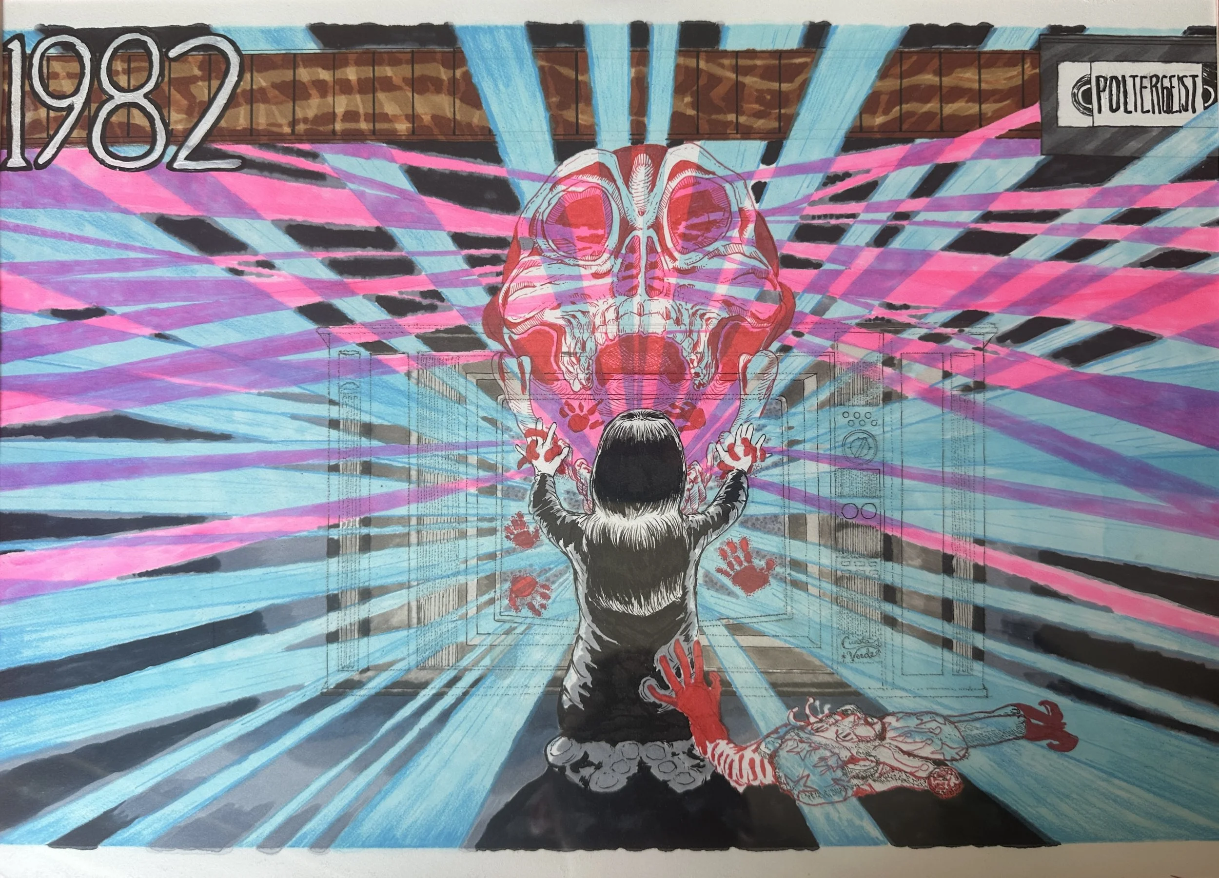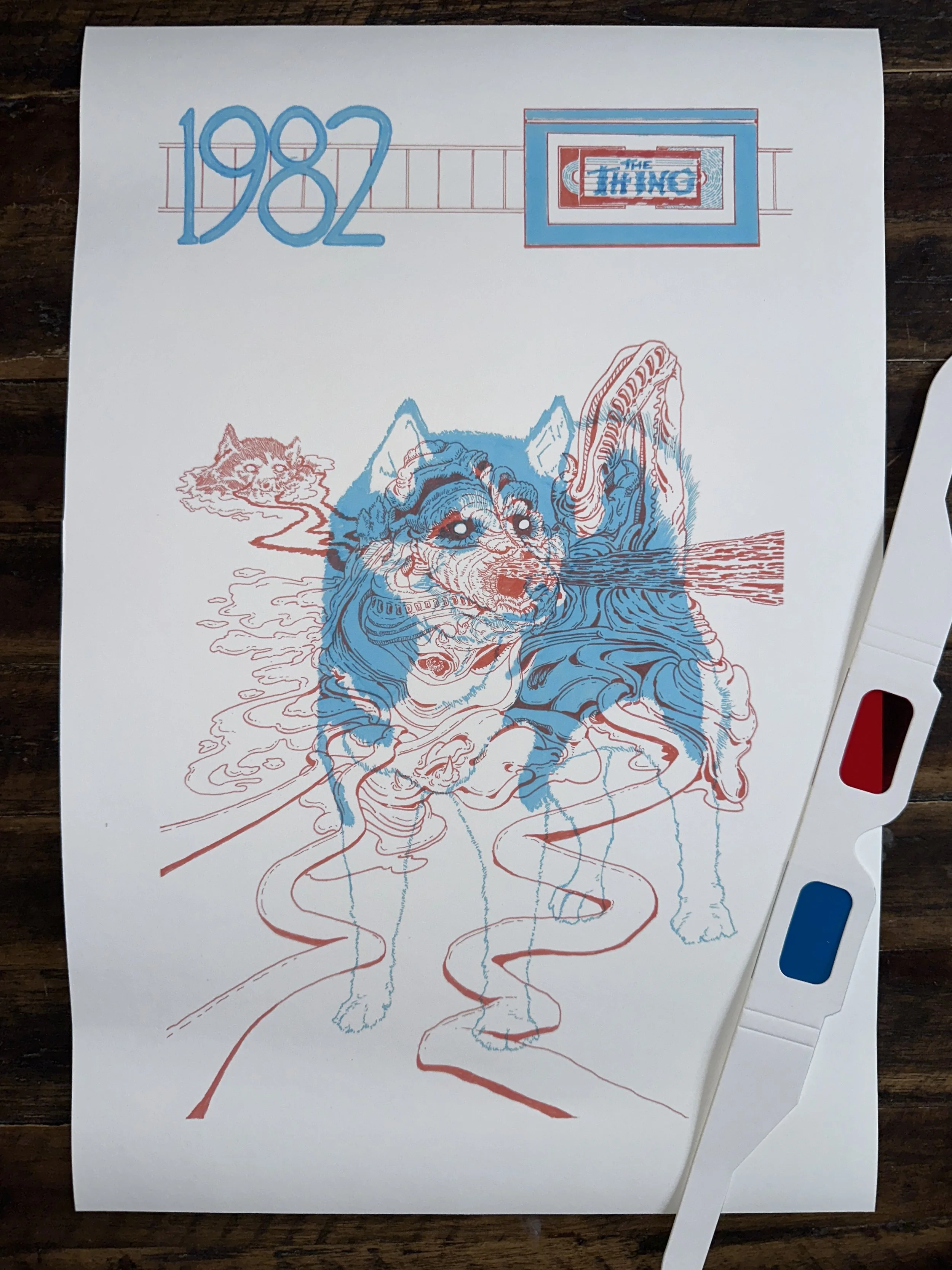 Some of these pieces are anaglyphs: two corresponding yet offset illustrations contrasted in cyan and red, often viewed through “3D glasses”. It was a fun challenge to create this using traditional methods, and a delight to watch viewers unlock the hidden, horrific images within.